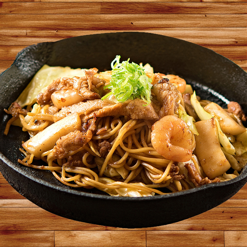 肉・イカ・えびの入った、焼そば界の定番メニューです。麺の量と太さ、たれの種類、トッピングは自由にお選びいただけます。